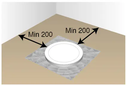 Golvbrunn i våtrum ska vara monterad så att minsta avstånd mellan väggens tätskikt och yttre fl äns är 200 mm, se fi g 3.8a. Golvbrunn ska placeras så att den går att rengöra och så att ett demonterbart vattenlås kan lyftas ur.